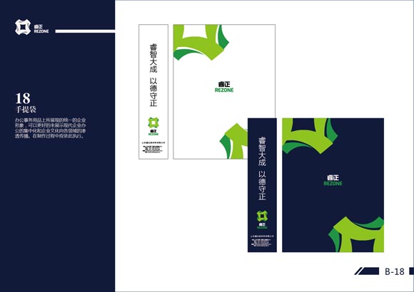 圖形用rezone首字母r變形而來,首尾相接,有循環(huán)延續(xù)之意。整個標識弧中帶方,有方圓結(jié)臺之意,是為“睿”。中間的小方形又貼合 “正”字,結(jié)合“睿正”二字,為中正博睿之意。標準色采用綠色,符合企業(yè)新能源特性。兩種綠色搭配,突出標識的層次和立體感。