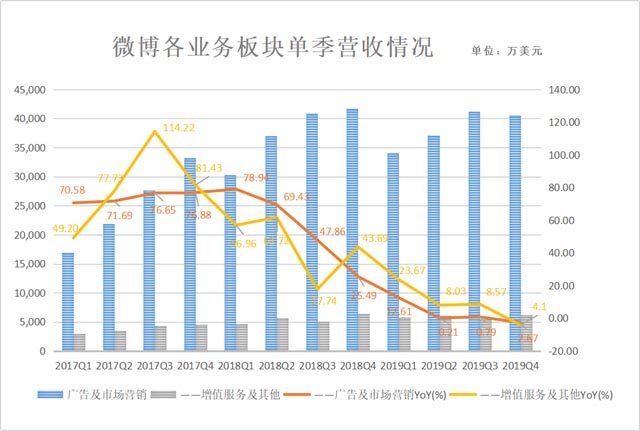 分業(yè)務(wù)來看,微博的營收來源主要來自:廣告和市場(chǎng)營銷收入、增值服務(wù)。廣告及市場(chǎng)營銷板塊是微博的營收大頭,2019年全年廣告和營銷營收15.3億美元,占公司總體營收的比例為86.44%,較2018年的15.0億美元增長(zhǎng)2%,來自大客戶和中小企業(yè)的廣告和營銷營收為14.3億美元,較2018年的13.8億美元增長(zhǎng)4%。增值服務(wù)包含會(huì)員與直播業(yè)務(wù),2019年全年微博增值服務(wù)營收為2.367億美元,較2018年的2.193億美元增長(zhǎng)8%,其增長(zhǎng)主要得益于2018年第四季度收購的直播業(yè)務(wù)所產(chǎn)生的營收。