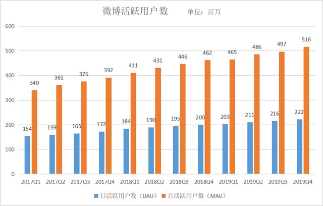 在用戶運(yùn)營層面,微博2019年12月的月活躍用戶數(shù)為5.16億,較上年同期凈增約5400萬,其中月活躍用戶數(shù)中約94%為移動(dòng)端用戶。2019年12月平均日活躍用戶數(shù)為2.22億,較上年同期凈增約2200萬。