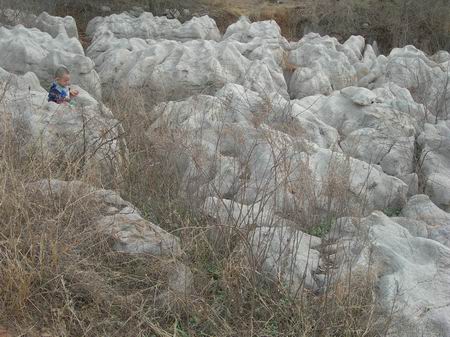 可能兩次都是仲春時(shí)候去的,雖然麥苗也很青綠,但“石海”及馬蓮臺(tái)附近的老樹卻仍舊那么原始,好像從來都是那樣,千萬年從來如此,不見一點(diǎn)綠意,等著我們?nèi)タ?。說是“石海”,我初見之下的感覺卻是一條自上而下的靜止的河流,不過是石頭的。有一句話覺得很有道理:“建筑是凝固的音樂”,這條奇怪的石河也像是被某種神秘法力在某一瞬間被凝固住了。照相永遠(yuǎn)無法復(fù)述她的壯美,以及給人的那種罕異、納悶的感覺。本來旌旗飄飄的山野飯店之中,突然出現(xiàn)一條“石頭河”,且地勢(shì)不平,越往上走,視野越開闊,卻也越感覺詭異,原本附近的山都是黃土山,石頭極少,況這些巨石都不像是人力所能完成的,據(jù)說附近還有人發(fā)現(xiàn)了貝殼,真是斗轉(zhuǎn)星移,滄海桑田,無法可想了。