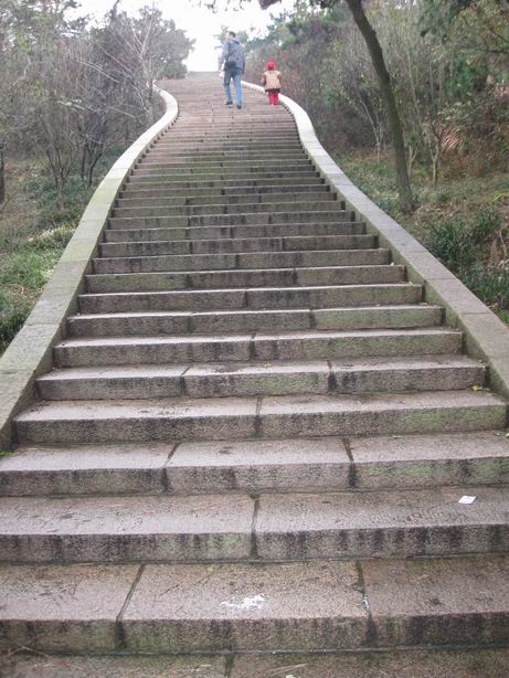 自山下逶迤而上,途經(jīng)一片青翠竹林,雖時已是冬天,但茂林修竹,頗具一番清雅之氣。出了竹林,卻是小橋流水,工整別致,橋墩上綠銹斑駁,倒也顯出些歷史感來。越往上走,越是靜謐安然,旁邊樹上已全部沒了葉子,蒼蒼古拙,像是走進了歷史。驀地,一條蜿蜒曲折的石階象幅畫一樣擺在我們面前,延伸向上而去,遙無盡頭,旁書“云梯”,走過這么多地方,象這么貼切的景觀題字實在不多,這云梯不象別的石階,生硬冷漠成銳角形,而是圓潤光滑,拐角處處理得象是工筆畫里的女子云裳,如若無物,真是柔美至極。信步走去,也是仿若平地青云,石階非常平滑,意識不到是在登山,不覺已走完了云梯500多級石階。沿途繼續(xù)向上,旁邊居然長著很多蘆葦,“荒草萋萋鸚鵡洲”的感覺,心里很是詫異。