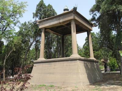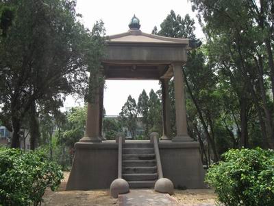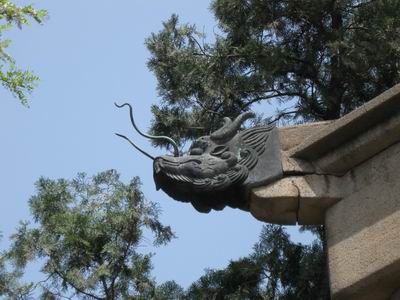 離神社不遠(yuǎn)的山坡上,現(xiàn)在是一座小公園,進(jìn)門就有一座風(fēng)格迥異的涼亭,它的線條與中國(guó)古典亭閣絕然不同,四角各有一個(gè)龍首,綠銹斑斑,原來(lái)是銅的,龍須昂首,完好無(wú)損,亭上是一朵銅制蓮花。亭子原來(lái)掛有銅鐘,現(xiàn)在只剩掛鈕還在。大日本帝國(guó)的喪鐘已經(jīng)不知去向。