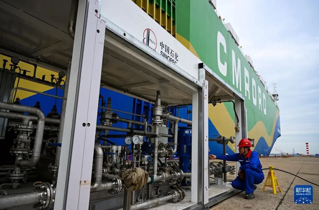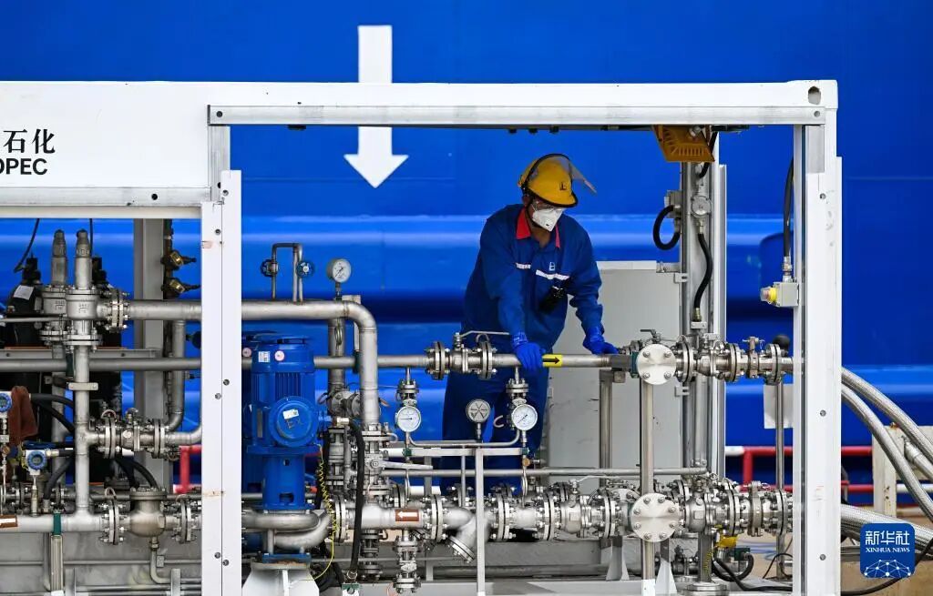 9月22日,在天津港環(huán)球滾裝碼頭,工作人員準(zhǔn)備進(jìn)行甲醇加注作業(yè)。新華社記者 趙子碩 攝