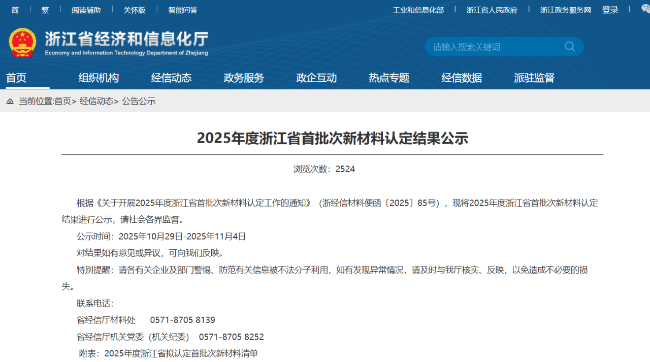 根據(jù)《關(guān)于開展2025年度浙江省首批次新材料認(rèn)定工作的通知》(浙經(jīng)信材料便函〔2025〕85號(hào)),現(xiàn)將2025年度浙江省首批次新材料認(rèn)定結(jié)果進(jìn)行公示,請(qǐng)社會(huì)各界監(jiān)督。